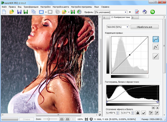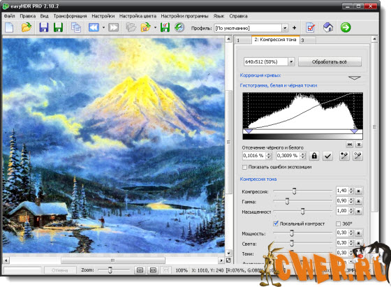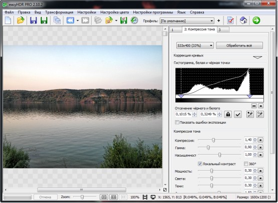easyHDR Pro - позволяет формировать HDRI из TIF, JPG и BMP-файлов, открывать формат Radiance, выровнять исходные изображения, проводить тональную компрессию. При модифицировании очередного параметра программа не бросается вычислять тональную компрессию, для этого надо нажать Preview. Вычисления можно неизменно остановить. Дабы работа шла быстрее, можно выделить только участок изображения, для которого будет изображен результат тональной компрессии. Позволяет подмечать обрезанные светлые и неясные участки. Очень неплохая программа с удобным удобопонятным интерфейсом и большим числом опций. Более эластичная, чем Photoshop, результаты тональной компрессии смотрятся более натуральными, чем из Photomatix.