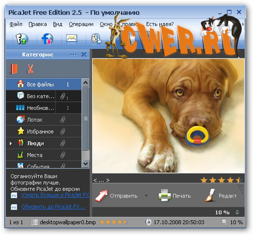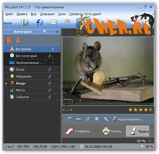 Удобный органайзер для каталогизации фотографий с поддержкой мгновенной коррекции сразу нескольких фотографий, высокой скоростью работы, достигаемой за счет максимального использования возможностей 3D-ускорителя видеокарты, удобным интерфейсом, печатью, слайд-шоу и многими другими полезными опциями, включая запись на CD/DVD, создание веб-галерей и возможность смены интерфейса программы с помощью скинов.