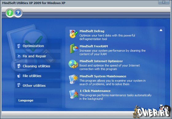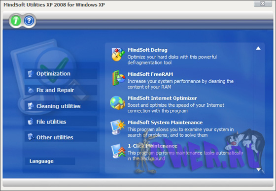 MindSoft Utilities XP - пакет программ, состоящий 19 утилит, позволяющий настроить работу операционной системы Windows XP. Программы, находящиеся в данном пакете помогут пользователю очистить место на жестком диске, дефрагментировать оперативную память и жесткие диски, повысить стабильность работы компьютера, повысить скорость работы соединения с интернетом, ускорить запуск приложений и многое, а также вы узнаете всё, относительно аппаратного и программного обеспечения компьютера. Также имеется множество других полезных возможностей. Программа может быть использована как специалистами, так и обычными пользователями ПК. Имеет приятный на вид и интуитивно-понятный на восприятие пользовательский интерфейс.