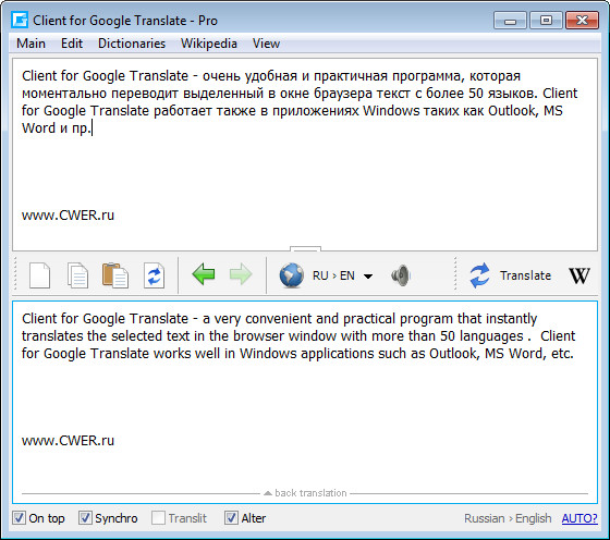 Client for Google Translate - очень удобная и практичная программа, которая моментально переводит выделенный в окне браузера текст с более 50 языков. Client for Google Translate работает также в приложениях Windows таких как Outlook, MS Word и пр. После установки вы увидите иконку Client for Google Translate в системном трее и каждый раз, когда вы хотите перевести некоторый текст, все что вам нужно сделать, это выбрать (выделить) текст и все будет переведено мгновенно. Перевод можно скопировать в буфер обмена. Также можно скопировать текст в буфер обмена и вставить в окно программы, вызываемое щелчком мыши по иконке программы в трее.