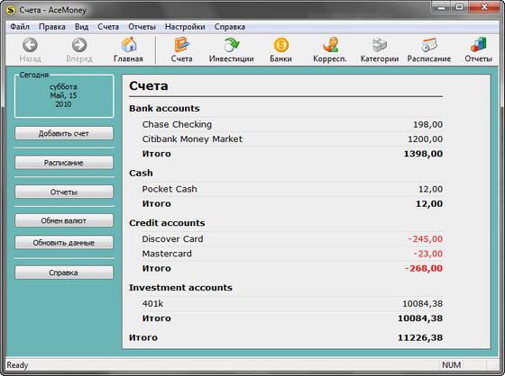 AceMoney помогает просто и эффективно управлять расходом личных денежных средств. Мы разрабатывали AceMoney для тех, кто не имеет ни малейшего понятия о бухгалтерии. Несмотря на свою простоту, программа обладает всеми качествами больших финансовых пакетов. Ваши расходы и доходы учитываются в нескольких валютах. Программа поддерживает более 150 валют и автоматически скачивает их курсы обмена из интернета. AceMoney позволяет с легкостью следить за текущим состоянием ваших акций и фондов. К тому же, программа позволяет скачивать текущую стоимость акций с российских и международных бирж.