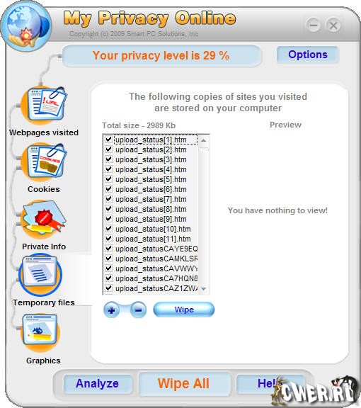 My Privacy – это программа для проверки конфиденциальной информации что хранится в вашем компьютере на уязвимость перед хакерскими атаками. На вашем компьютере может хранится информация, о которой вы давно уж забыли. Это может быть информация о вашей кредитной карте, логины, пароли, и т.д. Так же программа служит для очистки различных файлов, которые остаются после серфинга по интернету. Утилита очищает данные, полученные браузером Internet Explorer. Очистка данных происходит как автоматически, так и по желанию пользователя.