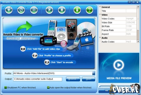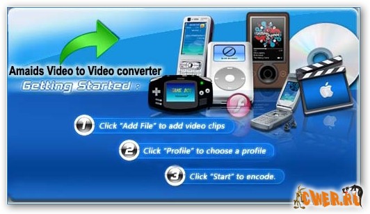 Amadis Video Converter Suiteis - конвертер преобразующий видео файлы в AVI (DivX, XviD, etc.), DV AVI, MP4 (inc. Sony PSP, Apple iPod, iPhone, AppleTV, Archos DVR, Creative Zen, MS Zune ), WMV, 3GP, 3G2, PSP, MP4, QuickTime (MOV, QT), SWF, DVD, VOB, VRO, MPEG 1, 2, MPG, DAT, VCD, SVCD, ASF, MJPEG, H.263, H.264, Real Video (RM, RMVB), DVR-MS, MKV. Очень легок в использовании, с приятным и дружественным интерфейсом.