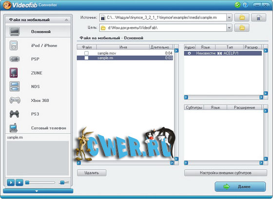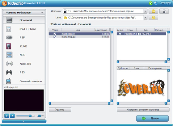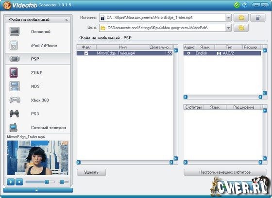 VideoFab Converter - незаменимый помощник для преобразования исходного видео файла с вашего компьютера для любого портативного устройства с дальнейшим просмотром на нем. Источником может являться: фильм из Интернета, клип, личное видео из цифровой видеокамеры или TV и другие записи. Все что от вас требуется - это "натравить" программу на источник ("жертву") и через некоторое время вы сможете насладиться просмотром своих любимых фильмов как на PS3 и Xbox 360, так и на мобильных устройствах таких как iPod, PSP, ZUNE, сотовый телефон и т.д.