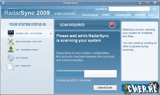 RadarSync 2009 - программа которая сканирует систему на предмет драйверов и установленных программ и сверяет с базой данных новых версий в сети Internet. После чего предлагает скачать более новые версии. Работает со всеми версиями ОС семейства Windows.