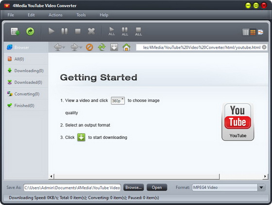 4Media YouTube Video Converter - программа для скачивания и конвертирования видео с YouTube. Программа конвертирует видео файлы в большинство популярных видео форматов таких, как: AVI, H. 264, MPEG-4 AVC, MPEG-4, MP4, DivX, XviD, 3GP, 3G2 видео. Поддержка IPod, iPhone, IPAD, Apple TV, PSP, PS3, Zune, Xbox.