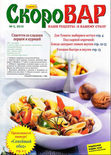 Аппетитные блюда для праздников и будней, для искушенных и молодых хозяек. Собрание любимых рецептов читателей, а также их письма. Читатели делятся своими секретами и получают призы за фирменные вкусности. Со «Скороваром» скоро варят и скоро едят! Тема номера: ягодные рецепты. Также в журнале рецепты салатов, закусок, выпечки, детское меню, горячие блюда, уроки кулинарии, советы доброй хозяйки, рецепты здоровья.