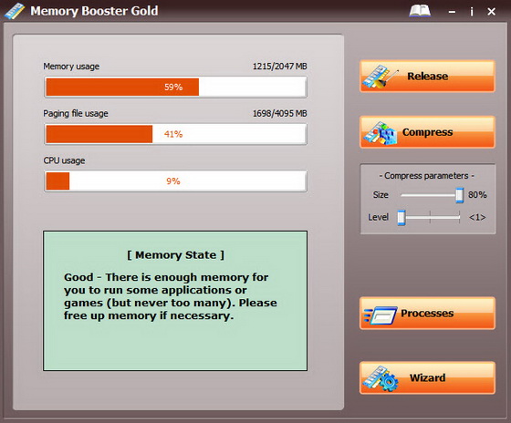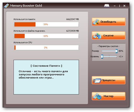 Memory Booster Gold - легкая в использовании утилита для мониторинга и управления системной памятью компьютера. Позволяет уменьшать время загрузки и улучшать производительность приложений, запускаемых в вашей системе. Программа является средством для решения различных проблем с оперативной памятью компьютера. Это богатая возможностями и легкая в использовании программа. Оперативная память является одним из самых главных объектов в компьютере и, если производительность памяти становится низкой, то это может приводить к частым зависаниям системы или уменьшению скорости работы компьютера. Если вы хотите улучшить производительность вашего компьютера или хотите избавится от фрагментации, собранной в вашей системе, то данная программа будет вам очень полезна.