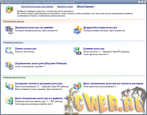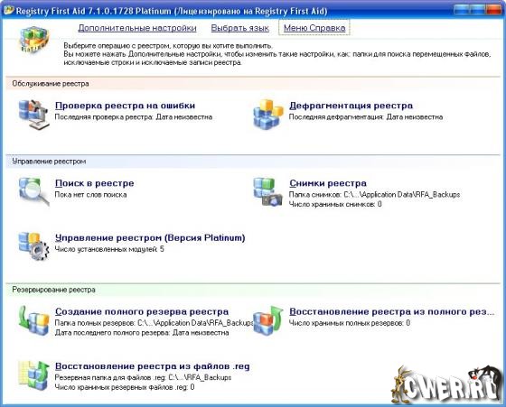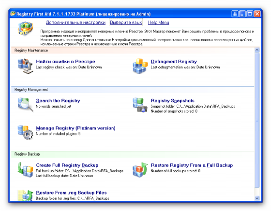 Registry First Aid Platinum - сканирует реестр на предмет испорченных или ненужных записей (оставшихся после удаления программ), тем самым обеспечивает более быструю работу компьютера и предотвращает сбои. Программа автоматически просматривает системный реестр и обнаруживает неверные ключи, которые вы сможете исправить или удалить. Также утилита производит поиск записей и сравнение их с файлами на диске, и, если найдена запись, соответствующая файлу, который был перемещен в другую папку, то программа скорректирует эту запись в реестре. Программа имеет опцию резервного копирования и восстановления реестра на случай, если система даст сбой, мультиязычный интерфейс, включая слабенький русский.