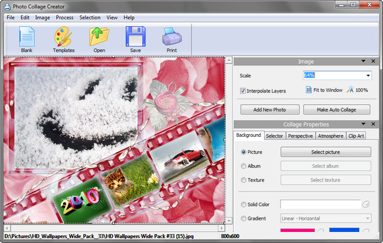 Photo Collage Maker - удобная программа для создания оригинальных композиций, состоящих из фона и нескольких фотографий. Создать красивый коллаж в программе можно быстро и просто: достаточно выбрать фоновое изображение из каталога, добавить пару-тройку собственных фотографий и поэкспериментировать с различными эффектами. Программа позволяет также добавлять надписи и украшения. Получившийся коллаж можно просмотреть на полный экран, сохранить или распечатать. Предусмотрена функция быстрого экспорта коллажей в любой из популярных графических форматов. С Photo Collage Maker вы сможете создавать удивительные композиции, не затрачивая на это много времени и сил. Интуитивно-понятный интерфейс, обилие графических материалов в комплекте, а также большое число дополнительных функций помогут вам создать действительно яркий и красивый коллаж.