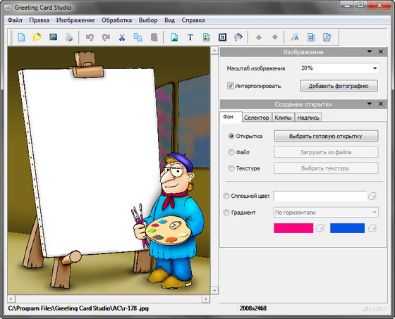 Greeting Card Studio - легкая в использовании программа для быстрого создания высококачественных поздравительных открыток. С помощью этой программы вы сможете создавать открытки, используя ваши собственные изображения, фон и текст. Программа содержит в себе готовые профессиональные шаблоны, предназначенные для быстрого создания открытки. Вам нужно всего лишь выбрать бумагу, нужный дизайн, открыть понравившийся шаблон, отредактировать открытку и распечатать ее на принтере.