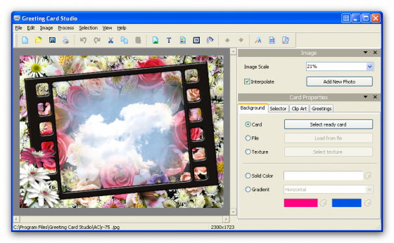 Greeting Card Studio - легкая в использовании программа для быстрого создания высококачественных поздравительных открыток. С помощью этой программы вы сможете создавать открытки, используя ваши собственные изображения, фон и текст. Программа содержит в себе готовые профессиональные шаблоны, предназначенные для быстрого создания открытки.