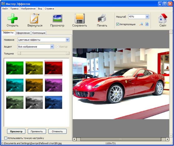 Мастер Эффектов - это новая программа для обработки фотографий при помощи разнообразных фильтров. С её помощью можно полностью преобразить любое изображение. Программа позволяет использовать более 50-ти эффектов, включая как традиционные, так и оригинальные. Вы сможете увидеть свои фотографии на фоне дождя и снега, в тумане и под облаками, добавить солнечный свет или закружить в потоке тайфуна.