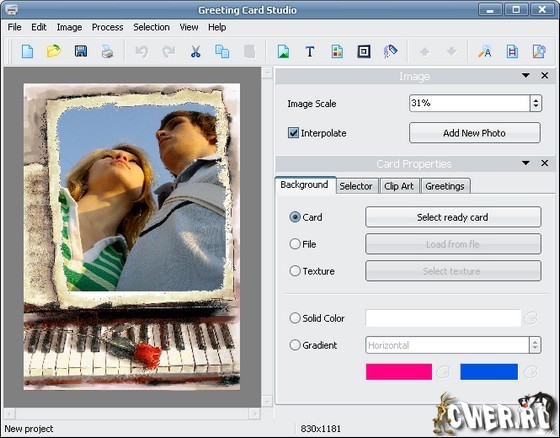 Greeting Card Studio - легкая в использовании программа для быстрого создания высококачественных поздравительных открыток. С помощью этой программы вы сможете создавать открытки, используя ваши собственные изображения, фон и текст. Программа содержит в себе готовые профессиональные шаблоны, предназначенные для быстрого создания открытки. Вам нужно всего-лишь выбрать бумагу, нужный дизайн, открыть понравившийся шаблон, отредактировать открытку и распечать ее на принтере. Также вы сможете создать собственный уникальный дизайн и наложить на картинки эффекты, рамки, границы, сделать фон и наложить различные изображения на вашу открытку. При этом, вам дается возможность масштабирования и переворачивания фотографий как вы пожелаете. Готовый результат вы сможете распечать на принтере или сохранить в один из графических форматов.