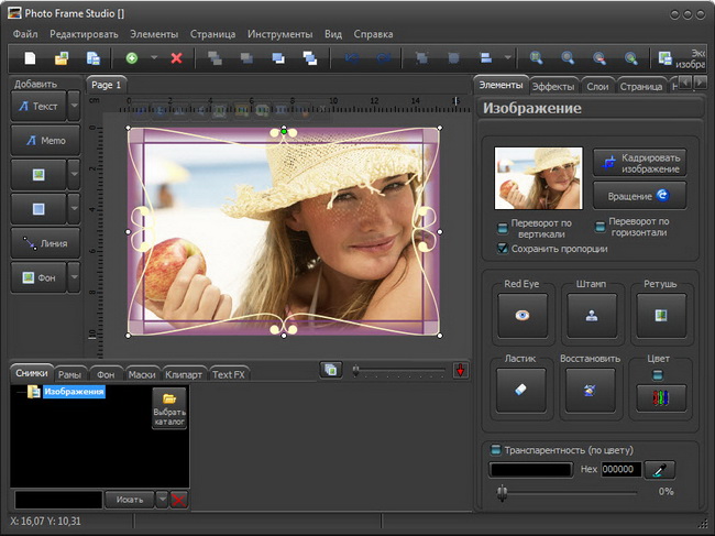 Photo Frame Studio - программа от польского разработчика MojoSoft, созданная для редактирования и декорации цифровых фотографий. Программа предлагает вам воспользоваться сотней шаблонов рамок для украшения, каждая их которых может быть изменена по вашим индивидуальным требованиям, включая фоновые цвета и изображения. Интерфейс программы был создан с уклоном на то, чтобы каждый пользователь смог без проблем воспользоваться этой программой. Вы сможете украсить ваши изображения с помощью добавления к ним разнообразных рамок, масок, фонов, теней или текста. Кроме того, вы сможете создать вашу собственную композицию шаблона для дальнейшего использования. Также данная программа позволяет вам производить калибровку изображений, включая обрезку и увеличение изображений, а также удаление эффекта красных глаз. Интерфейс программы переведен на множество языков, включая русский язык.