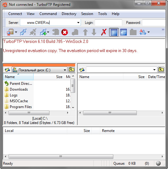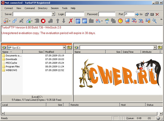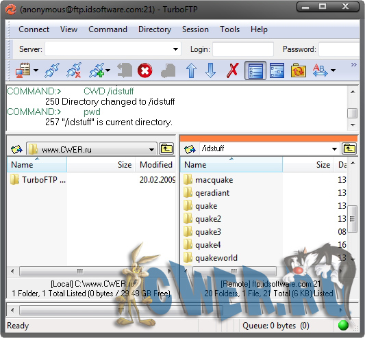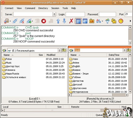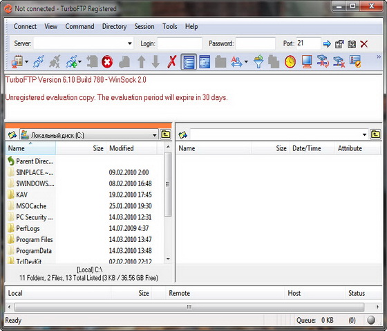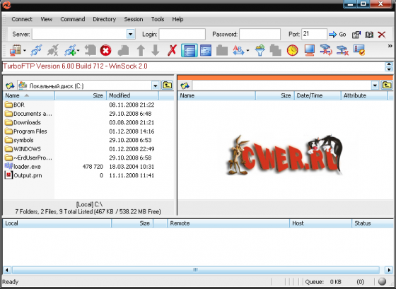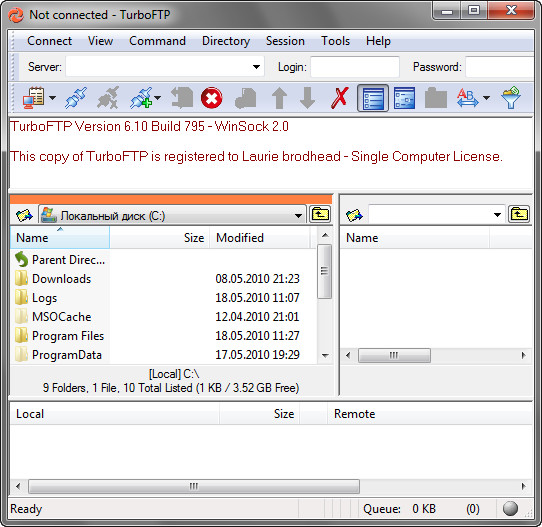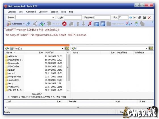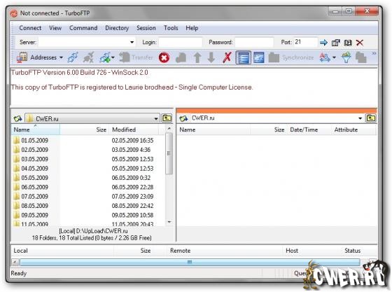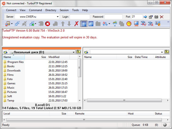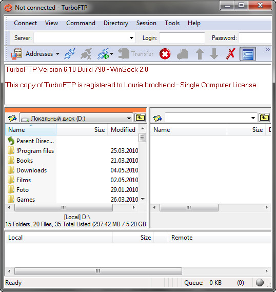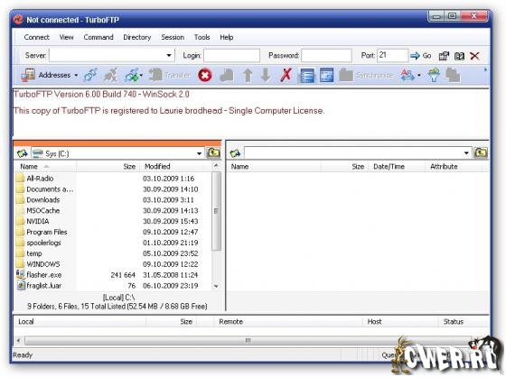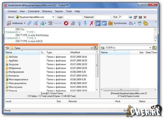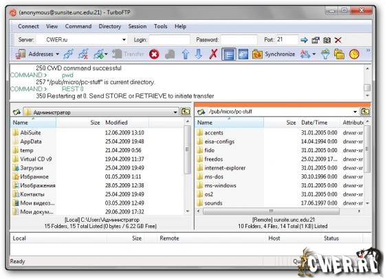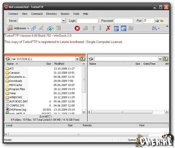 TurboFTP - FTP-клиент с самыми разнообразными опциями, такими как синхронизация директорий парой кликов, слежение за буфером обмена, автодозвон, докачка файлов, способность передавать большие файлы (более 4 GB), поддержка SOCKS 4 и SOCKS 5, планировщик заданий, управление скоростью загрузки и т.д.