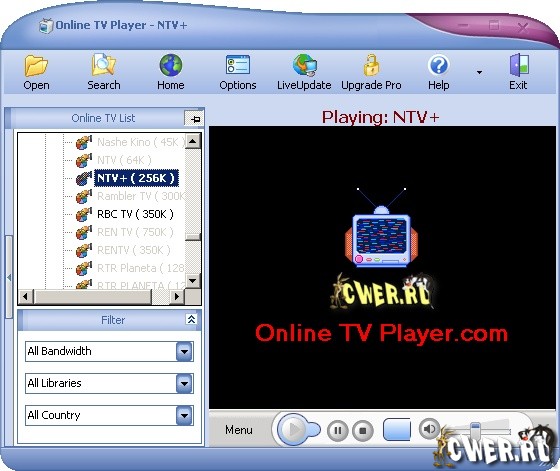 Online TV Player - бесплатный медиаплеер, который позволяет просматривать более 850 бесплатных Интернет-каналов и слушать более полутора тысяч онлайн-радиостанций на вашем ПК. Поддерживается работа как с Windows Media, так и с Real Video форматами, имеется опция просмотра в полноэкранном режиме. Среди других возможностей стоит отметить простоту использования Online TV Player, плюс возможность смены скинов.