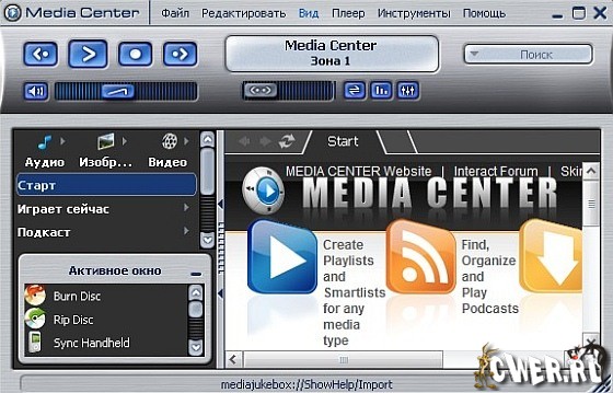 J.River Media Center - мультимедийный центр (раньше назывался Media Jukebox). Проигрывает большинство популярных аудио и видео форматов, включая MP3, аудио CD (поддерживает CDDB) и DVD, может преобразовывать CD-аудиотреки в WAV и MP3, переписывать на жесткий диск виниловые диски и кассеты (убирая при этом помехи и шумы), а также создавать аудио-CD, причем для всех этих функций программа имеет множество настраиваемых параметров. Кроме этого, есть очень хороший и мощный по своим возможностям органайзер мультимедийных файлов, медиаредактор, эквалайзер, встроенный DSP и удобный планировщик заданий для автоматизации процессов проигрывания/записи, а также поддержка пульта ДУ. Из необязательных, но приятных функций - становящаяся уже почти стандартом для "приличных" программ возможность изменения внешнего вида с помощью скинов, мини-режим проигрывателя и "телевизор" (c картами ATI).