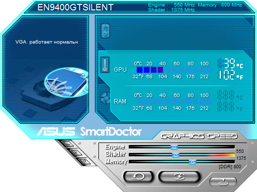 Smart Doctor - фирменная утилита от ASUS, предназначенная для видеокарт, созданных на графических чипсетах от ATI и NVIDIA. Данная программа позволяет пользователю с легкостью отслеживать состояние видеокарты, сообщая обо всех неисправностях, которые возникают (будь то перегрев, остановка вентиляторов и другие проблемы), а также сообщает о температурах памяти, чипсета, скоростях вращения вентиляторов и т.д.