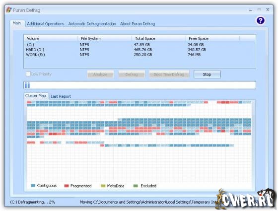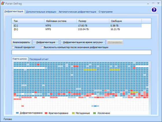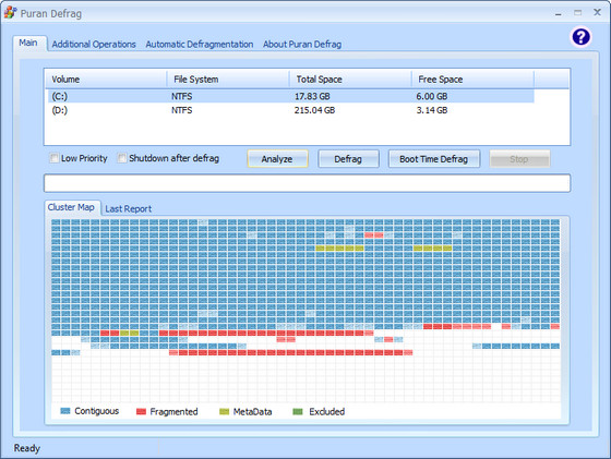 Puran Defrag - это высокоскоростной дефрагментатор, обладающий необычайно простым и удобным интерфейсом, а также некоторыми необычными функциями. Необычность включает в себя не только непривычно удобный интерфейс, но и сама технология дефрагментации, которая заключается, как в полной дефрагментации дисков, или отдельных ее файлов из простого контекстного меню, так и размещение часто употребляемых файлов в область более быстрого доступа, что как и понятно, существенно увеличивает производительность. Даже если для полной дефрагментации файла не хватает места, программа использует все имеющиеся ресурсы и дефрагментирует файл, насколько это возможно. Данный дефрагментатор идеально подойдет для тех пользователей, кому некогда, а обслуживать систему все равно надо. Имеет очень простой интерфейс, который не вызовет каких-либо проблем при использовании данной программы.