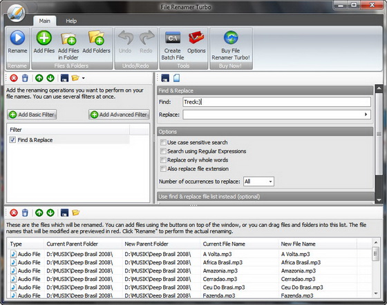File Renamer Turbo - программа для пакетного переименования файлов. Способна одновременно переименовывать тысячи файлов и папок, а также содержит более 20 специализированных фильтров, значительно упрощающих данный процесс. Также с ее помощью можно редактировать тэги музыкальных файлов MP3, OGG, WMA, M4A, APE, FLAC и MPC. Программа в автоматическом режиме позволяет получать информацию с сайта MusicBrainz.org и заполнять тэги.