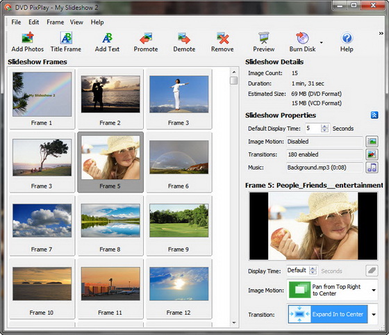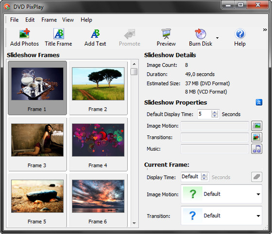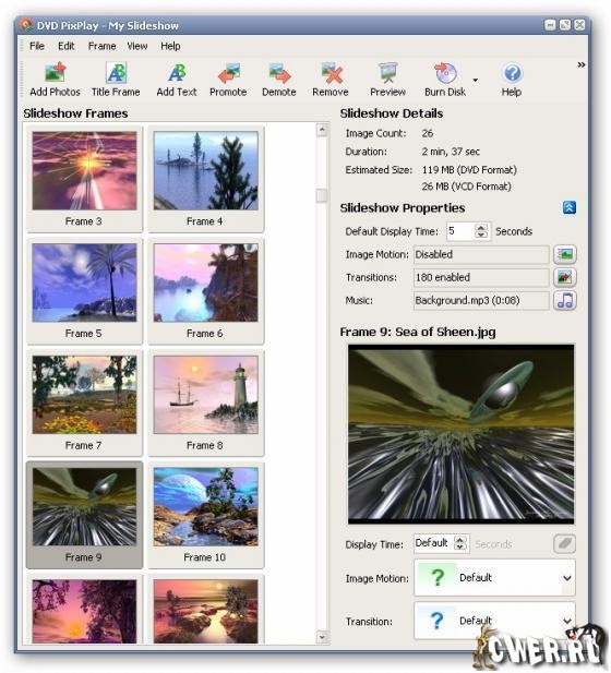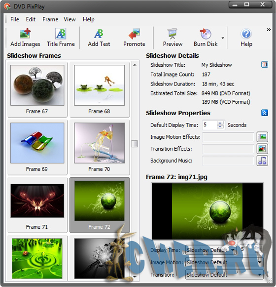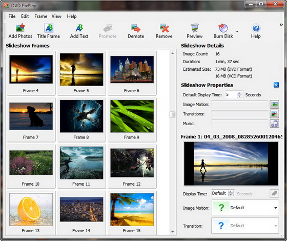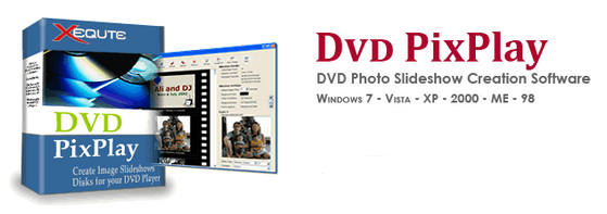 DVD PixPlay - программа для создания из картинок, видео и музыки, дисков формата DVD, VCD или SVCD. Поддерживает все популярные форматы графики (JPEG, JPEG2000, GIF, BMP, PNG и т.д.), форматы фотокамер (CRW, CR2, NEF и т.д.), звуковые (MP3 и WAV) и видео форматы (AVI, MPEG). Есть возможность добавления фоновой музыки и разных эффектов для последующего просмотра на DVD проигрывателе. Содержит более 160 графических эффектов.