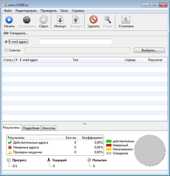eMail Verifier - программа позволяет сэкономить ваше время и деньги, если вы коммерческая или некоммерческая организация, которая иногда рассылает новостные бюллетени своим клиентам или членам и которой необходимо поддерживать чистоту списка e-mail адресов для рассылки. Программа работает по тому же принципу, что и почтовая система ISP. Она извлекает электронные адреса с Сервера Доменных Имен (DNS) и пытается соединиться с SMTP-сервером, симулируя отправку сообщения. На самом деле, сообщение не отправляется, программа разрывает соединение, как только сервер сообщает, существует ли данные e-mail адрес. Программа является очень эффективным средством обработки уведомлений об ошибках доставки. Приложение проверяет каждый адрес из данного листа рассылки, что позволяет вам обнаружить до 90% «плохих» адресов. Обладает многоязычным интерфейсом с поддержкой русского языка.