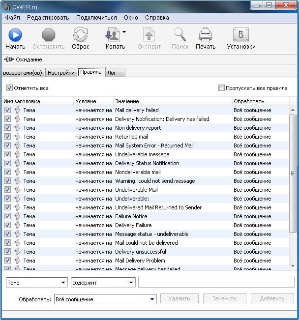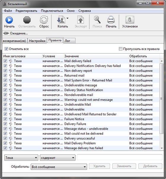 eMail Bounce Handler – инструмент для фильтрации и обработки вернувшихся писем. Программа способна распознавать возвраты способом, определяемым настройками, а также извлекать адреса получателей, что дает вам возможность повторно отправить сообщение или удалить неудачный адрес из списка рассылки. Программа умеет обрабатывать любые возможные источники, содержащие письма-возвраты: локальные файлы, локальные и удаленные почтовые ящики, отрывки текста, а также буфер обмена. В ситуациях удаленного доступа программа поддерживает как POP, так и IMAP протоколы, отслеживая возвраты и никак не затрагивая другие сообщения. В результате обработки писем-возвратов вы получаете список «плохих» адресов, который вы можете использовать для очистки имеющегося у вас списка рассылки или для повторной отправки сообщения. Обладает многоязычным интерфейсом с поддержкой русского языка.