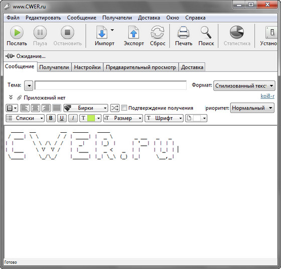 MaxBulk Mailer - это полнофункциональное программное обеспечение для составления и посылки писем. С помощью этой программы, вы сможете посылать индивидуализированные пресс-релизы, прайс-листы и любой текст или HTML документ своим клиентам. Программа отличается скоростью работы, легкостью в настройке и использовании. Позволяет работать как в текстовом формате, так и HTML, позволяющем стилизовать текст документа, а также обладает полной поддержкой файловых вложений в письма. Данный почтовый клиент позволит вам увеличить продажи, улучшить качество работы вашего отдела обслуживания, а также позволит вам выйти на новые рынки. Программа обладает простым в использовании многоязычным интерфейсом с поддержкой русского языка.