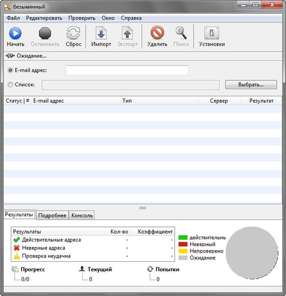 eMail Verifier - программа позволяет сэкономить ваше время и деньги, если вы коммерческая или некоммерческая организация, которая иногда рассылает новостные бюллетени своим клиентам или членам и которой необходимо поддерживать чистоту списка e-mail адресов для рассылки. Программа работает по тому же принципу, что и почтовая система ISP. Она извлекает электронные адреса с Сервера Доменных Имен (DNS) и пытается соединиться с SMTP-сервером, симулируя отправку сообщения. На самом деле, сообщение не отправляется, программа разрывает соединение, как только сервер сообщает, существует ли данные e-mail адрес. Программа является очень эффективным средством обработки уведомлений об ошибках доставки. Приложение проверяет каждый адрес из данного листа рассылки, что позволяет вам обнаружить до 90% «плохих» адресов. Обладает многоязычным интерфейсом с поддержкой русского языка.