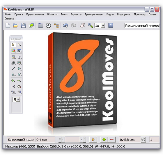 KoolMoves - утилита для создания анимационных эффектов в формате Macromedia Flash (.SWF) и кадров для анимированных GIF-файлов и анимации в других популярных форматах. В состав программы входят инструментарий для рисования объектов различной формы, импорт векторной графики, добавление звуковых файлов, множество различных эффектов, в том числе текстовые эффекты, добавление действий к тексту и кадрам. Приложение также содержит готовые шаблоны, библиотеку кнопок и векторных заготовок.