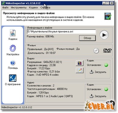 VideoInspector - программа, которая покажет полную информацию о Вашем видеофайле и поможет найти и скачать нужные кодеки для его воспроизведения.