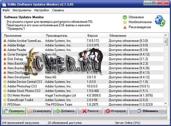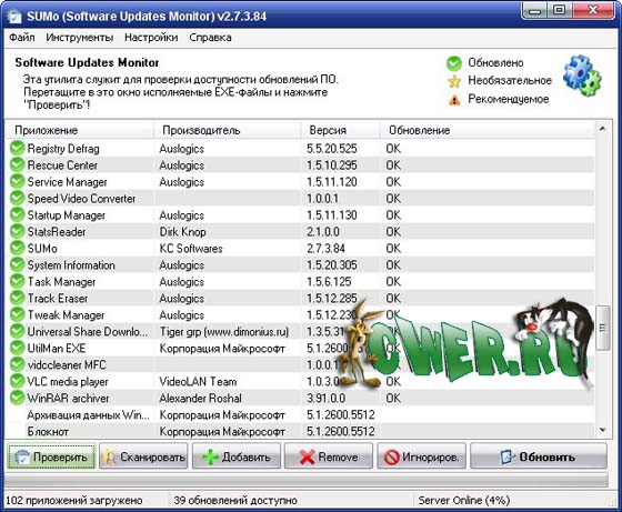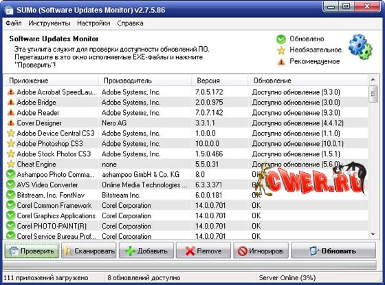 SUMo - утилита для отслеживания обновлений программного обеспечения, установленного на компьютере пользователя. Главная задача SUMo - уведомление о появлении новых версий приложений, с которыми вы работаете. Для проверки наличия обновления к той или иной программе, достаточно перетащить исполняемый файл программы в окно SUMo. В этом окне можно увидеть название приложения, номер версии, название компании-разработчика и информацию о наличии обновлений. SUMo удобна тем, что позволяет проверить наличие обновлений, не открывая при этом сами программы. С помощью SUMo можно проверять апдейты сразу для нескольких приложений, а затем выборочно загружать их.