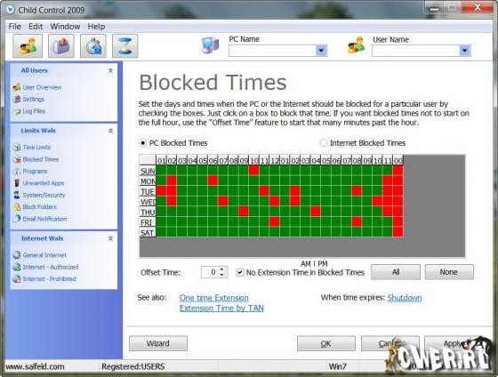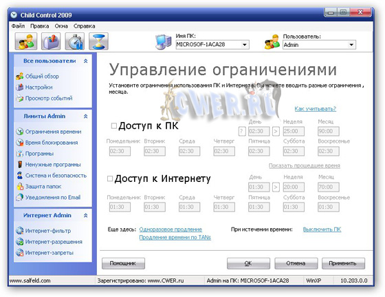 Salfeld Child Control - программа ограничивает время, проводимое вашими детьми за компьютером, как только выделенное им время закончится, компьютер автоматически выключится и повторный вход будет возможен только после ввода пароля. Ограничение можно ввести как по общему времени (например, не более 1 часа в день), так и по периоду времени, когда можно работать (например, с 22:00 до 8:00 доступ запрещен). Кроме этого, программа позволяет запретить посещение нежелательных сайтов, а также заблокировать доступ к определенным дискам и папкам.