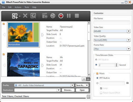 Конвертер MS PowerPoint файлов презентаций в другие видео форматы, поддержка ppt, pptx, pptm, ppsx, pps, ppsm, potx, potm, pot и других файлов презентаций, конвертирование в AVI, H.264/MPEG-4 AVC, MPEG2, WMV, MOV, FLV, HD H.264/MPEG-4 AVC, HD MPEG 2 TS, HD WMV, HD AVI, HD MOV и другие форматы, конвертирование презентаций в FLV формат с оптимизацией для YouTube, Google Video и других сервисов, поддержка пакетного режима работы, предварительный просмотр результата, выбор и настройка параметров конвертирования.