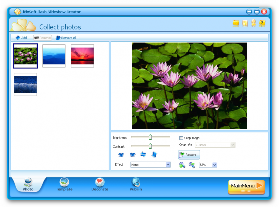iPixSoft Flash Slideshow - эта программа является уникальной чтобы помочь вам в создании Flash слайд-шоу, миниатюры галерея, флэш-альбома и флэш-презентации с профессиональных шаблонов с красочными переходами, текстовыми надписями и фоновой музыкой. На выходе вы можете получить следующие форматы слайд-шоу :SWF, EXE файлов и HTML файлов. С помощью программы также можно сделать более краше свой сайт или блог.В обращении с iPixSoft Flash-слайдшоу не требуются профессиональных навыков, ее интерфейс просто настолько легок , что даже начинающий пользователь создаст свой красочный проект за несколько минут.