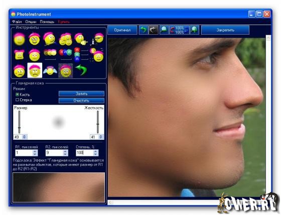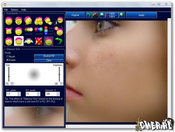 PhotoInstrument - Волшебный "Легкий" Редактор для обработки портретов цифровых фотографий. От Очистителя Кожи до придания ему Гламурного Вида "глянцевых журналов", попутно включая инструменты для: ретуширования, удаления красных глаз, сглаживания морщин, увеличения чёткости, коррекции цвета и многого чего еще, для приданию портрету совершенного вида и желаемой привлекательности.
