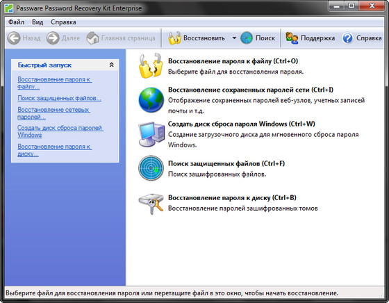 Passware Kit Enterprise - набор инструментов для подбора или определения паролей к файлам (более 100 видов), созданными самыми известными в мире программами: Office, Excel, Word, Windows XP/2000/NT, Access, Outlook, Outlook Express, Exchange, WinZip PKZip ZIP, WinRAR RAR, VBA Visual Basic modules, Internet Explorer/ EFS - Encrypted File System, FileMaker/ Acrobat, Quicken, QuickBooks, Lotus 1-2-3, Lotus Notes, Lotus, Organizer, Lotus WordPro, Quattro Pro, Backup, Project, MYOB, Peachtree, Paradox, ACT!, Mail, Schedule+, Money, WordPerfect и MS Office 2007, а также определения ключа Windows XP/2000/NT/7.