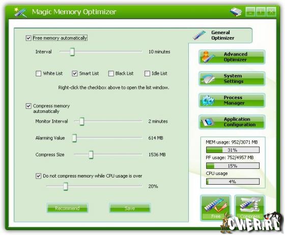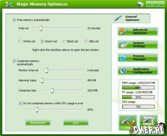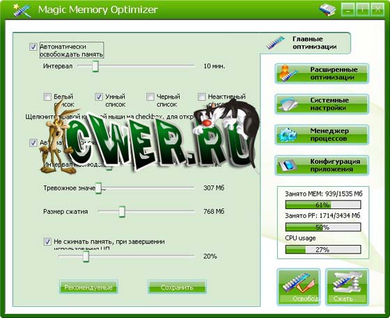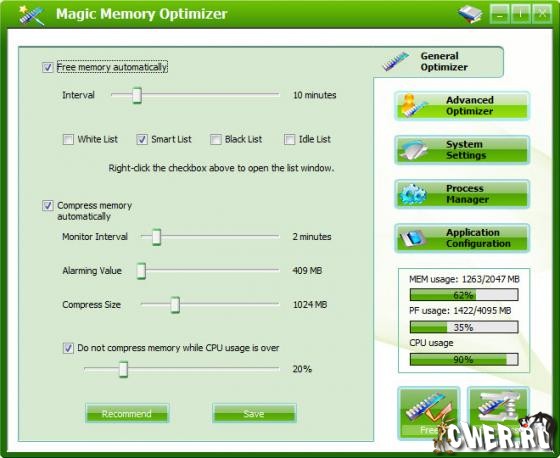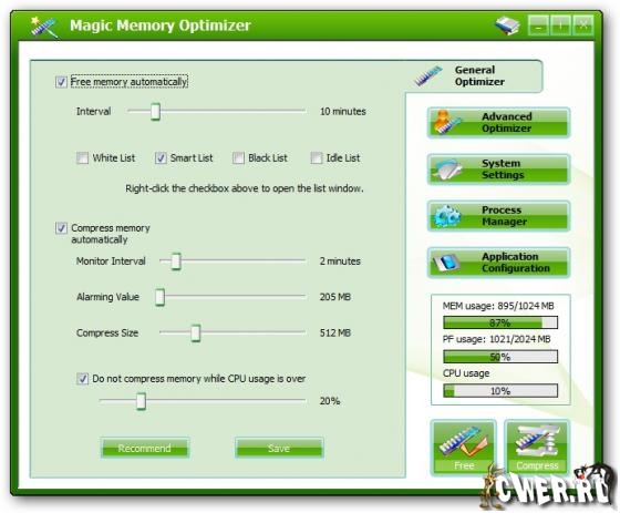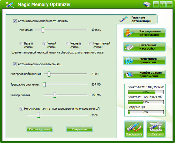 Magic Memory Optimizer - предназначена для решения трудных и критических проблем возникающих в оперативной памяти компьютера. Память - самый драгоценный ресурс на вашем компьютере; если ее становится недостаточно, ваш компьютер начинает медленно работать, "зависать" или наступает крах, - падение системы. Сама же Windows не управляет памятью на должном уровне. Со временем, не имеет значения какой объем памяти у вас имеется, Windows постепенно для своей работы и прикладных программ отбирает остатки свободной памяти, что легко может привести вашу систему к краху. Magic Memory Optimizer решит все эти проблемы, высвобождая и восстанавливая беспечно растраченную системой память для ваших программ.