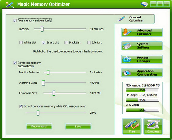 Magic Memory Optimizer предназначена для решения трудных и критических проблем возникающих в оперативной памяти компьютера. Память - самый драгоценный ресурс на вашем компьютере; если ее становится недостаточно, ваш компьютер начинает медленно работать, "зависать" или наступает крах, - падение системы. Сама же Windows не управляет памятью на должном уровне. Со временем, не имеет значения какой объем памяти у вас имеется, Windows постепенно для своей работы и прикладных программ отбирает остатки свободной памяти, что легко может привести вашу систему к краху. Magic Memory Optimizer решит все эти проблемы, высвобождая и восстанавливая беспечно растраченную системой память для ваших программ.