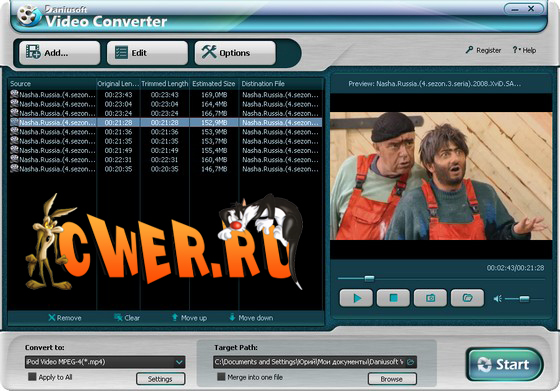 Daniusoft Video Converter - программа, с помощью которой вы можете с удовольствием и без каких-либо ограничений смотреть любимое видео и слушать музыку на любых портативных проигрывателях и иных устройствах воспроизведения. В отличие от других видеоконвертеров, в Daniusoft Video Converter есть разнообразные функции редактирования видео. Вы можете удалить темные участки на экране видео (функция video cropping), выделить нужные части видеофайла (video trimming) и сохранить их в отдельный файл, изменить характеристики видеофайла (в частности разрешение, скорость передачи битов, частоту смены кадров, яркость, насыщенность цвета, звуковые дорожки). Используя функции редактирования, вы можете конвертировать видеофайл так, как вы хотите.