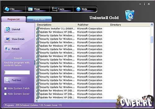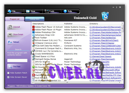 Программа для деинсталляции приложений. Uninstall Gold обладает большим количеством функций: показывает скрытые установленные программы, сортирует список программного обеспечения по заданному фильтру, удаляет некорректно инсталлированные и деинсталлированные программы.