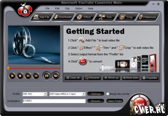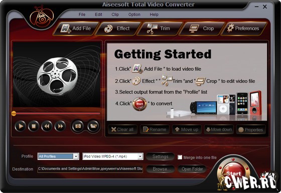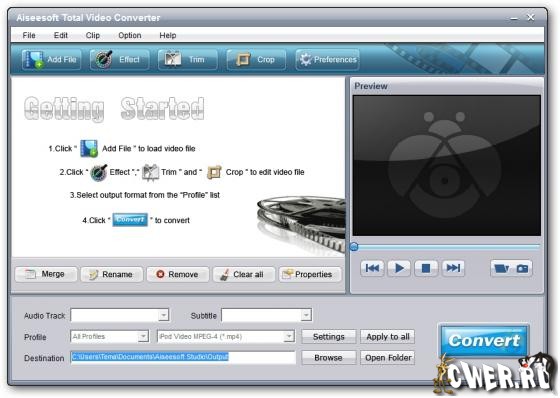 Aiseesoft Total Video Converter - программа предназначена для конвертации видео в форматы MP4, H.264, AVI, WMV, WMA, FLV, MKV, MPEG-1, MPEG-2, 3GP, 3GPP, MOV, RM, RMVB, M4A, AAC, WAV и т.д. Поддержка популярных мультимедиа проигрывателей, таких как: PSP, iPod, iPhone, PS3, Zune, iRiver, Walkman, Pocket PC и т.д. Функция извлечения аудиодорожек из входного файла и конвертации в форматы M4A, MP3, AC3, AAC, WMA, WAV, OGG. Функция для извлечения и конвертации определенной части входного файла. Настройка параметров аудио и видео для выходного файла. Слияние нескольких видеофайлов в один. Функция, позволяющая обрезать часть кадра. Режим «Zoom», позволяющий настроить размер и качество изображения.