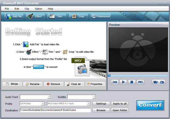 Aiseesoft MKV Converter - позволяет конвертировать MKV файлы в видео форматы, такие как H.264/AVC, WMV, DivX, MP4, MOV, и XviD, или извлекать MP3, WAV, WMA, AAC и M4A. Есть поддержка пакетного режима работы, предварительный просмотр результата, выбор и настройка кодеков, выбор и настройка параметров конвертирования, поддержка iPod, PSP, Apple TV, PS3, Xbox и других мобильных устройств, высокая скорость работы, высокое качество результата, приятный и удобный интерфейс.