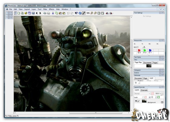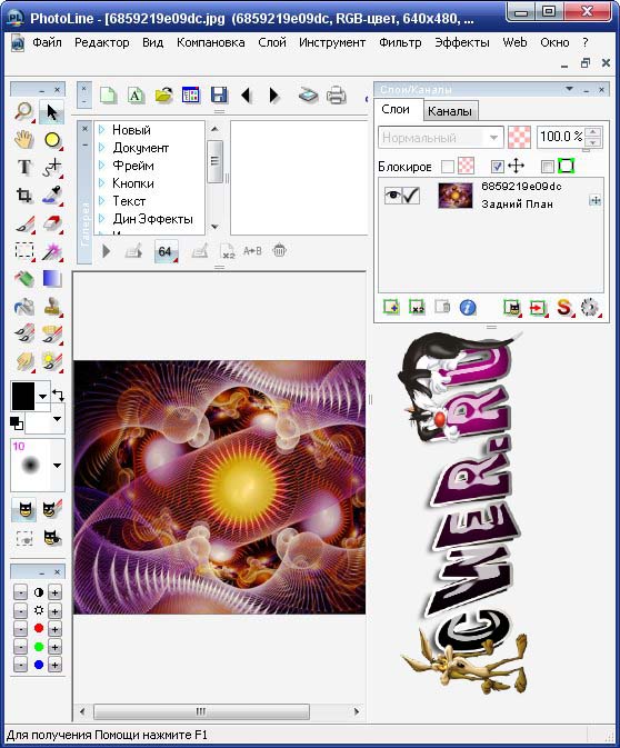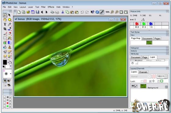 PhotoLine - простая в обращении программа, представляющая собой редактор растровой и векторной графики. Данный редактор позволяет редактировать как готовые фотоизображения, так и рисовать различные картинки при помощи специальных эффектов, инструментов и фильтров. В программе присутствует полная поддержка цветовой модели CMYK, работа с файлами форматов PLD, PDF, TIF, BMP, GIF, JPEG, CMX, PCD, PCX, PNG, PSD, EPS, PICT, TGA, IMG, ICO, ANI, XBM, IFF, ESM, CGM, PIC, CVG, GEM, WMF и EMF.