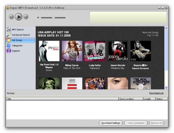 Super MP3 Download - это простая в использовании программа, которая позволяет быстро загрузить из более 100 млн. MP3 из крупнейших сетевых бесплатных ресурсов, а также прослушать музыку онлайн, прежде чем загрузить ее. Вы можете по результатам поиска решить, что скачать. Super Mp3 Download всегда приносит вам самые популярные песни в мире, он рекомендует вам хитов 100 Billboard каждую неделю, списки хитов по 14 категориям, от электро до религиозных, от хип-хопа до классики и т.д. Кроме того, Вы можете сделать расширенный поиск по исполнителю, названию, альбому, изданию.