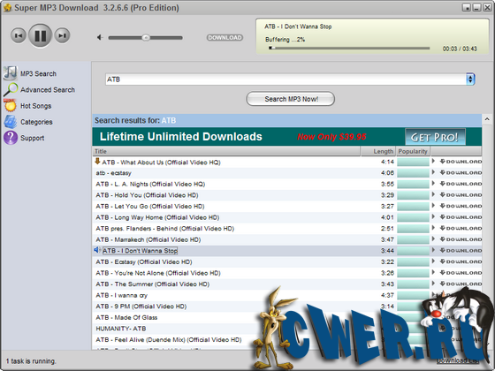 Super Mp3 Download Pro - прямой доступ к бесплатной музыке. Этот mp3 загрузчик надолго обеспечит Вас музыкальными композициями. В мире существуют тысячи групп и исполнителей, предлагающих свое творчество бесплатно. Шанс найти среди них что-нибудь по душе очень велик. Чтобы облегчить Ваш поиск, программа предложит топ сто недели и лучшее в четырнадцати жанрах. Вы сможете сначала прослушать мелодию и лишь потом сохранить её на жесткий диск.