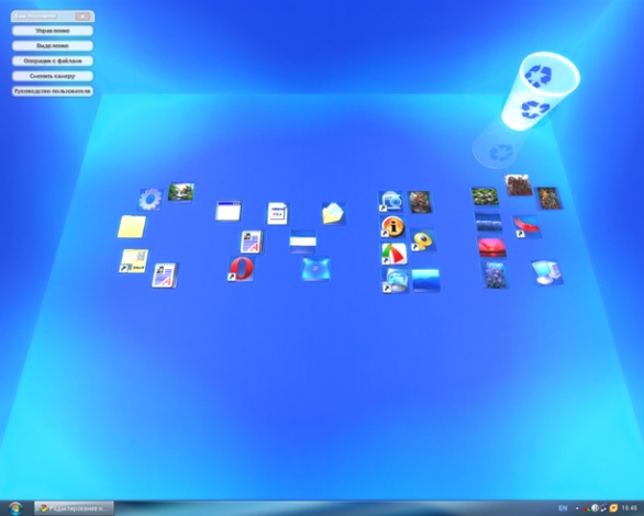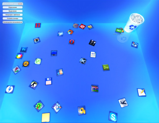 Real Desktop - программа для изменения вида рабочего стола Windows, преобразующая его в 3-х мерную поверхность. Real Desktop вдохнет новую жизнь в ваш Рабочий стол и превратит его в настоящий реальный рабочий стол. Насладитесь естественностью графики и невероятной динамикой и звуковым сопровождением. Программа использует DirectX и имеет физический движок, но на быстродействии компьютера это не сильно сказывается. После установки достаточно нажать на ярлык - и у вас уже 3D Рабочий Стол! Отключается таким же образом.