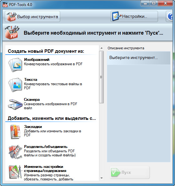 PDF-Tools — набор полезных инструментов для манипуляции с PDF файлами. С помощью данного набора вы сможете с легкостью создавать новые PDF документы из изображений, сканера и текстовых документов, изменять содержимое существующих PDF документов (добавление закладок, объединение и разъединение PDF файлов, извлечение страниц и изображений, оптимизация PDF документов, изменение настроек PDF документа, включая размер и разрешение страницы, конвертация PDF в оффисные документы и т.д.), а также отправлять и загружать файлы по почте или через FTP-соединения. Стоит упомянуть, что данная программа входит в состав PDF-XChange Pro. Все операции в программе осуществляются с помощью пошаговых мастеров. Интерфейс программы многоязычный и обладает поддержкой русского языка.