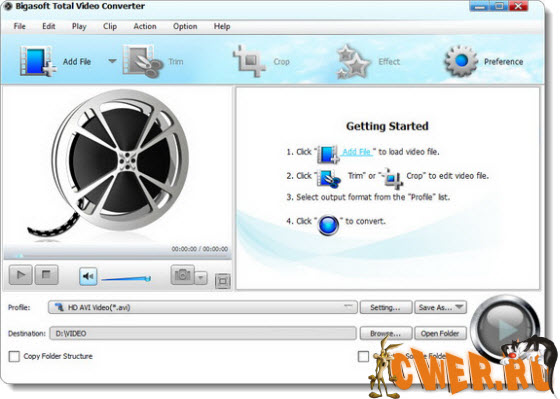 Bigasoft Total Video Converter - программа, которая окажет вам помощь в конвертировании ряда популярных форматов видео-файлов, таких как: AVI, Xvid, DivX, H.264, MP4, 3GP, MKV, WMV, RM, FLV, MOV, WebM, VP8, 720p, 1080p, 1080i HD, AVCHD, между собой с последующим просмотром их на портативных устройствах, мобильных телефонах, MP4-плеерах и персональных компьютерах.